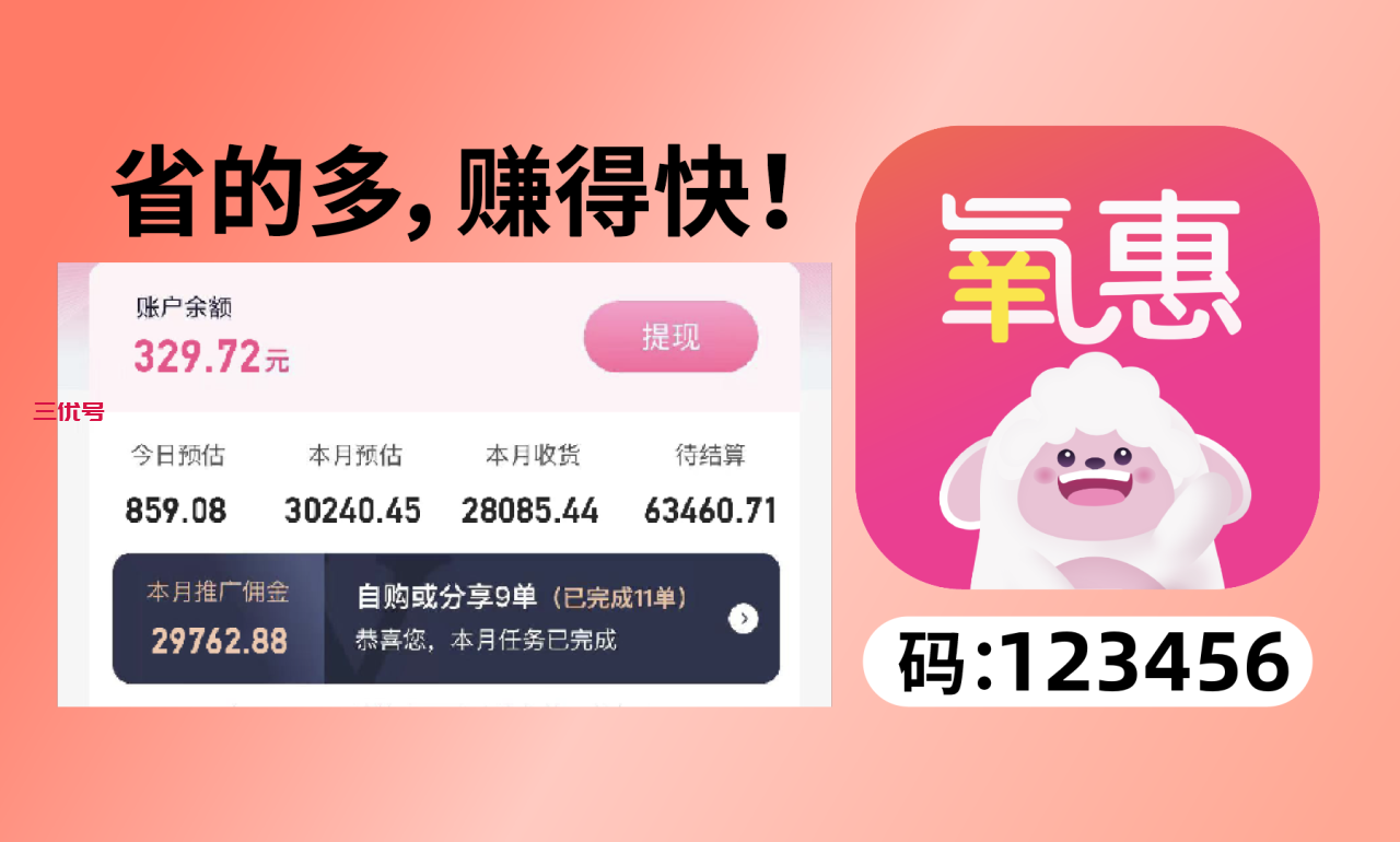氧惠(全网优惠上氧惠)——是与以往完全不同的抖客+淘客app!2023全新模式,我的直推也会放到你下面,送1:1超级补贴(邀请好友自购多少,你就推广得多少,非常厉害),欢迎各位团队长体验!也期待你的加入。氧惠邀请码123456,注册就帮你推广,一起做到百万团队!