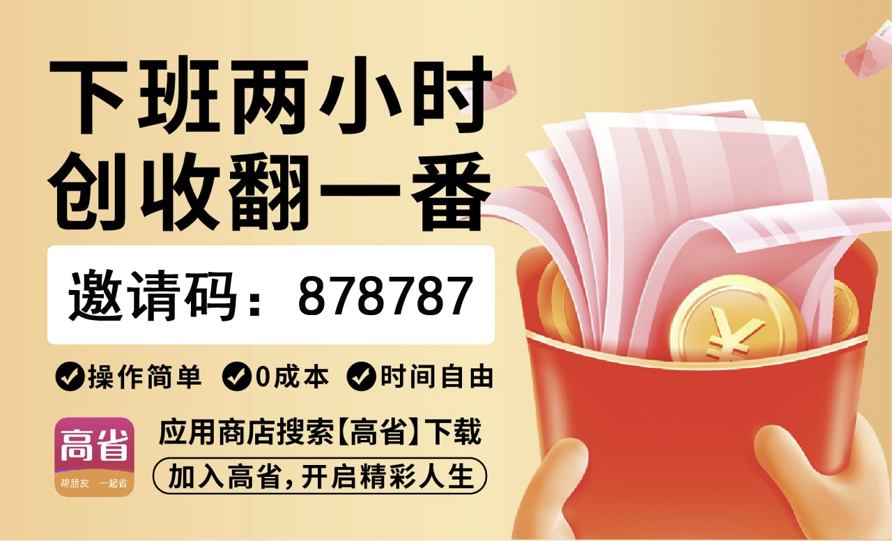 高,分享推广赚钱多的平台。佣金更高,模式更好,终端用户不流失。0投资,稳定可靠,百度有几百万篇报道,期待你的加入。应用市场下载【高省】邀请码878787(本邀请码为超级邀请人邀请码),注册送2皇冠